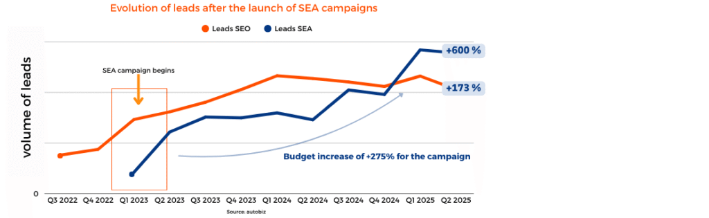 Depuis 2023 nous gérons les campagnes SEA pour l’un de nos clients. Comme le montre le graphique ci-dessous, le nombre de leads SEO a progressé dès le lancement de la campagne SEA. Celle-ci étant un succès, nous avons progressivement augmenté le budget, entrainant ainsi une croissance des leads SEA. Nous avons également observé une hausse des leads SEO, corrélée à cette dynamique sur le SEA.